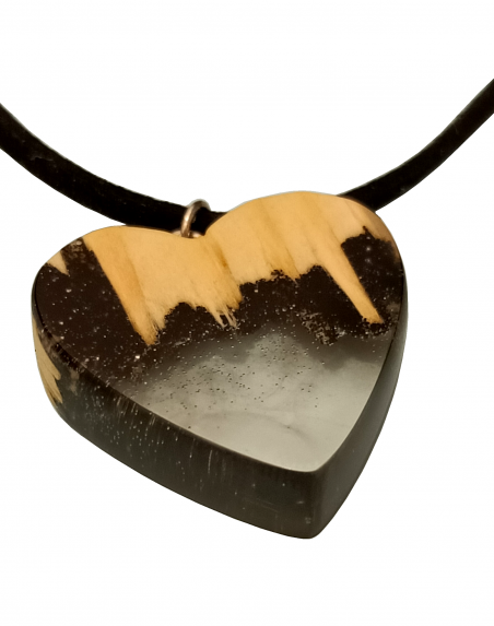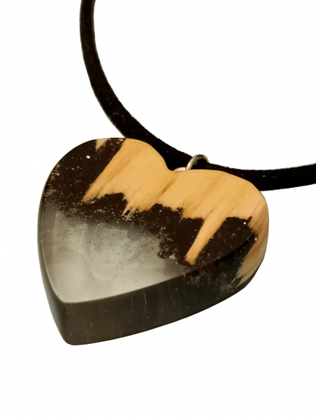 Wisiorek w kształcie serduszka, wykonany z drewna świerkowego i żywicy, zawieszony na czarnym rzemyku. Jasne drewno, potraktowane zostało moim autorskim procesem, który ma za zadanie zaakcentować naturalną strukturę drewna i odciąć jasną powierzchnię od transparentnej, lekko zabarwionej na czarno żywicy.